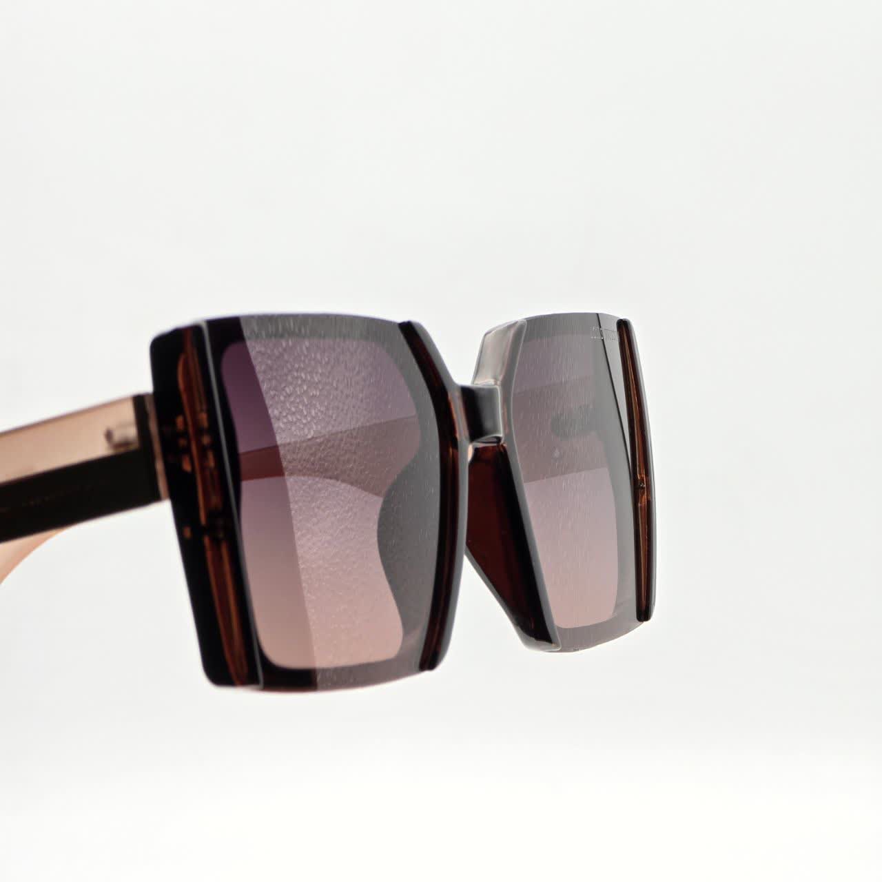 - فریم مستطیلی ضخیم (Chunky): بدنه جلویی عینک با طراحی مستطیلی و گوشههای زاویهدار، حسی از قدرت و اعتماد به نفس را القا میکند. رنگ بدنه جلویی قهوهای تیره (Dark Havana/Chocolate) است که حالتی نیمهشفاف دارد و بسیار شیک است.