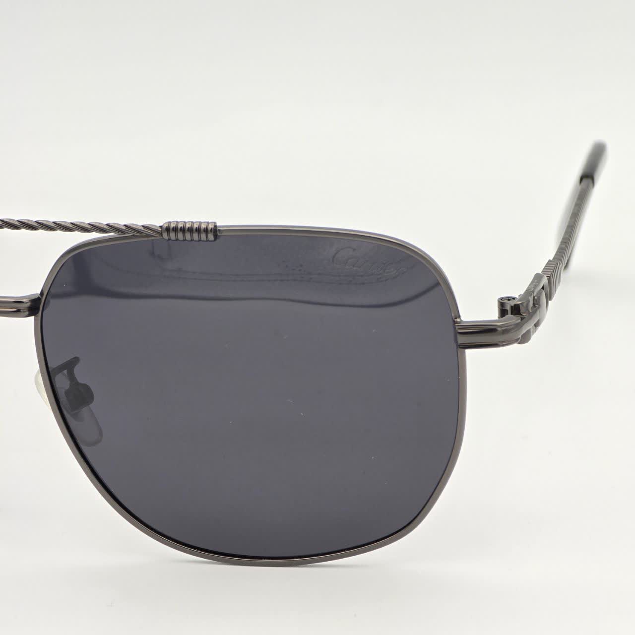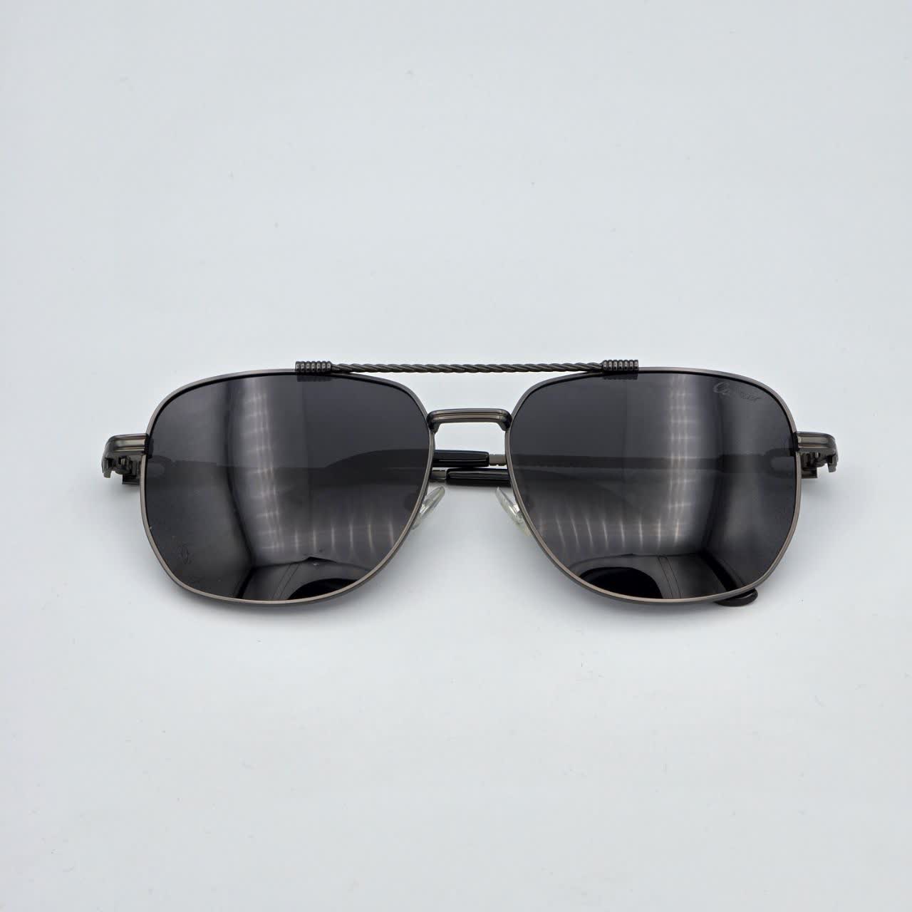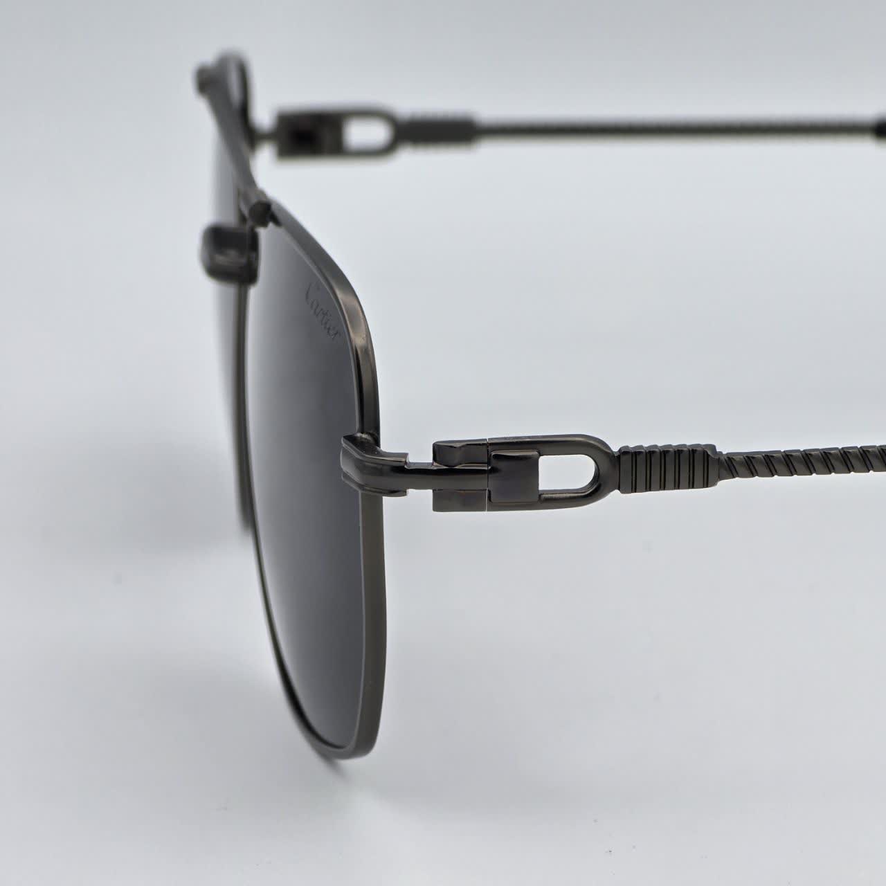 این عینک آفتابی با الهام از طراحی‌های جاودانه برند کارتیه ساخته شده است. بدنه تمام فلزی با رنگ گان‌متال (Gunmetal) یا دودی تیره، به همراه جزئیات پیچ‌خورده (Rope Motif) روی پل بینی و دسته‌ها، ظاهری بسیار مردانه، قدرتمند و صنعتی به آن بخشیده است.